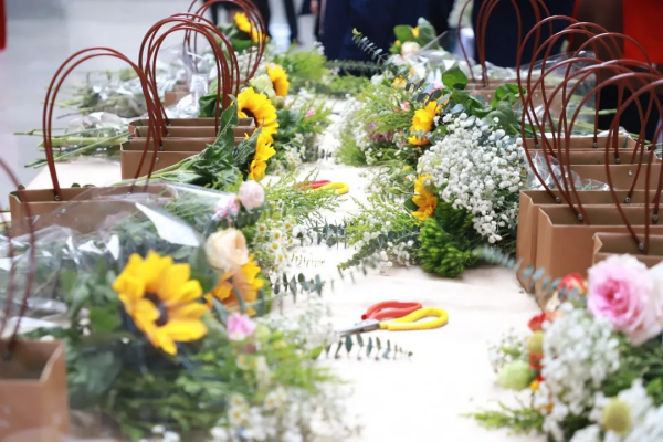 現(xiàn)場(chǎng)插花環(huán)節(jié),“女神”們拿起喜歡的花朵,認(rèn)真構(gòu)思,修剪枝葉,搭配色彩,興致勃勃地創(chuàng)作,熱烈地相互交流,現(xiàn)場(chǎng)充滿歡聲笑語。