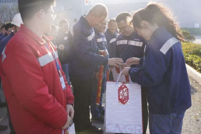 上午9點,中偉銅仁(上市主體)產業(yè)基地總經理趙能華走進基地各部門工作場地,為兩千多名正投入新春第一天工作中的員工送上開工紅包,寓意新年“開門紅”,并祝愿大家龍年大吉、宏圖大展。