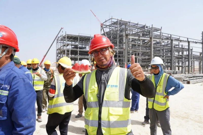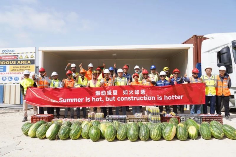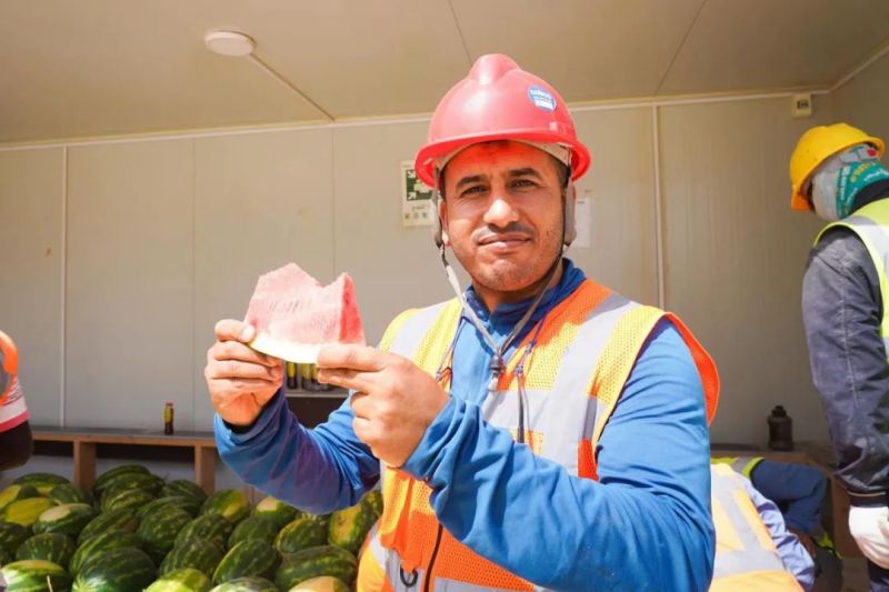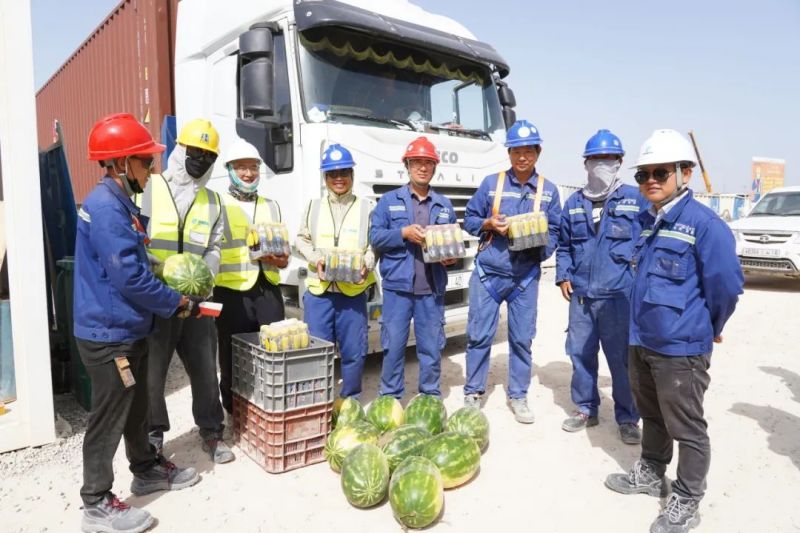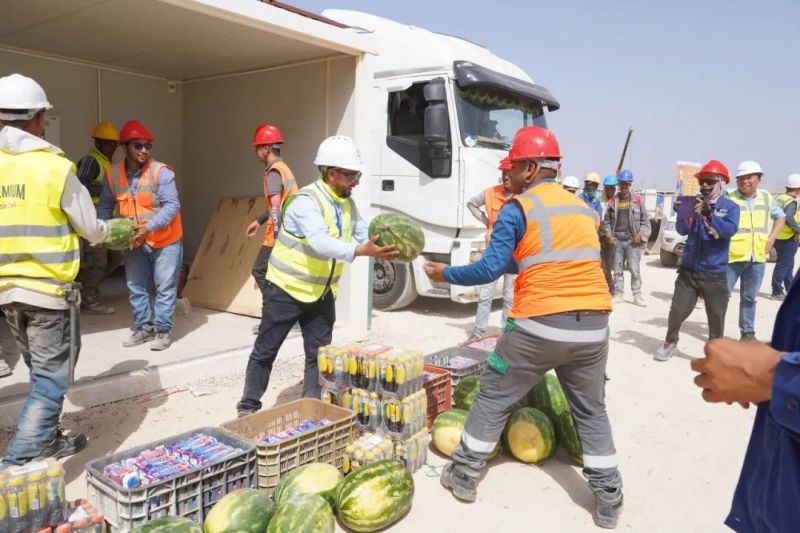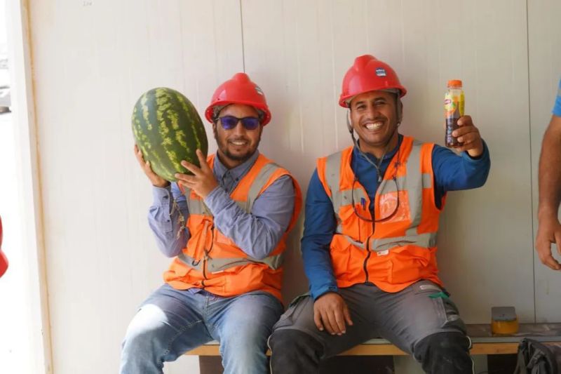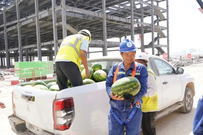 盡管高溫炙烤,項目現(xiàn)場的工人們?nèi)詧允匾痪€、不畏酷暑、辛勤工作,確保工程建設(shè)的順利進(jìn)行。此次,摩洛哥項目組為施工人員準(zhǔn)備了500瓶酸奶、500瓶涼茶、2000斤西瓜等防暑降溫物品,按各單位人數(shù)送至施工現(xiàn)場分配發(fā)放。