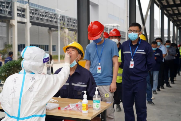 一同堅(jiān)守在抗疫一線的還有南部產(chǎn)業(yè)基地安環(huán)部。在接到防疫命令后的第一時間,他們緊急響應(yīng),連夜安排全體員工和施工方人員進(jìn)行核酸檢測,在1天內(nèi)完成了全部4000多名員工的核酸檢測,并安排人員在基地進(jìn)行24小時值守,勸阻非必要人員進(jìn)出基地,協(xié)助維持秩序,收集和了解基地員工的緊急需求,筑牢疫情防線。以人為本 眾志成城兵馬未動,糧草先行。南部產(chǎn)業(yè)基地后勤保障組連日來與時間賽跑、克服困難,圍繞園區(qū)人員飲食保障、廠區(qū)公共區(qū)域全覆蓋的保潔消殺、防疫物資的調(diào)度發(fā)放、管牢疫情防控大門等多項(xiàng)工作,全力做好服務(wù)保障。